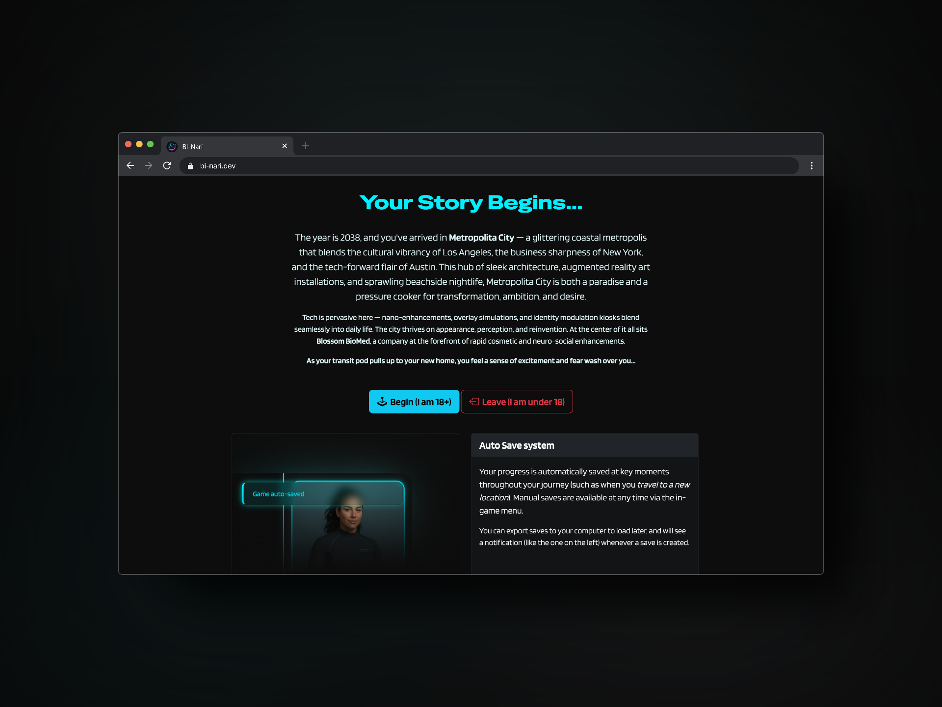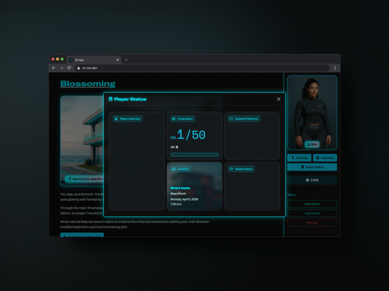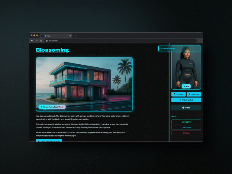 Tech is pervasive here — nano-enhancements, overlay simulations, and identity modulation kiosks blend seamlessly into daily life. The city thrives on appearance, perception, and reinvention. At the center of it all sits Blossom BioMed, a company at the forefront of rapid cosmetic and neuro-social enhancements.